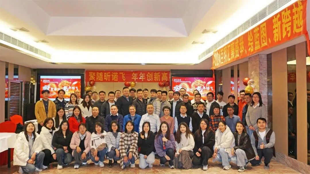 在工作人员的精心筹备下,2023年的年会尾牙晚宴在珠海新海利酒楼以最具活力的方式有序进行。大厅里“凝聚当下,龙鼐腾飞”为背景,“2024百明汇襄盛兴、绘蓝图、新跨越”、“聚随昕诺飞 年年创新高”的横幅高高挂,喜悦的气氛洋溢着整座酒楼。